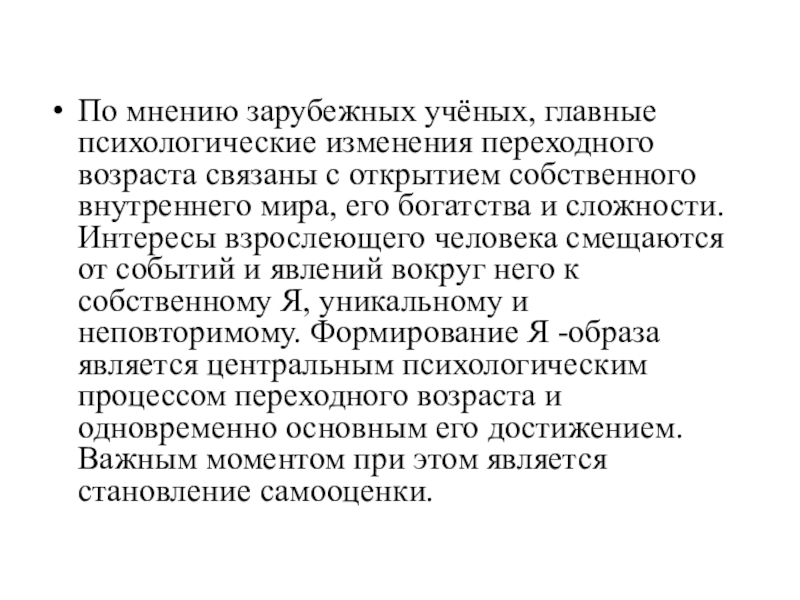 Слайд 7По мнению зарубежных учёных, главные психологические изменения переходного возраста связаны с
