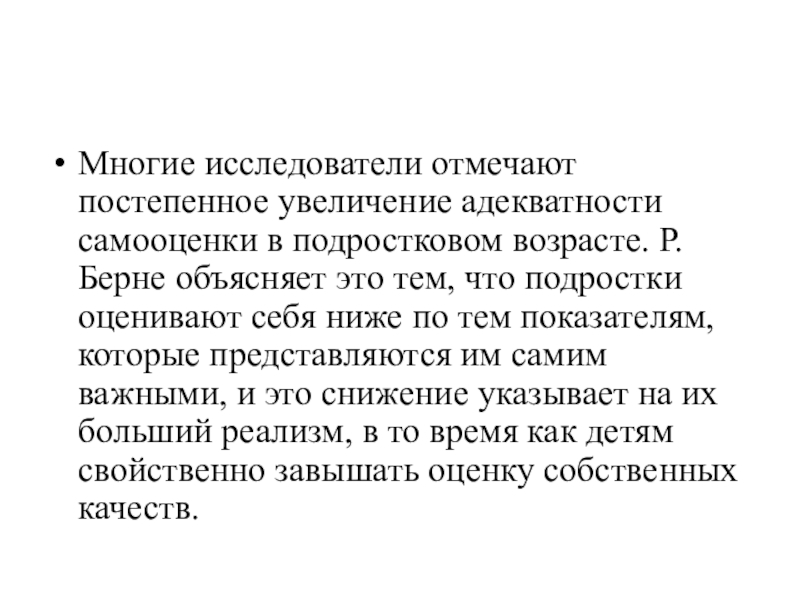Слайд 8Многие исследователи отмечают постепенное увеличение адекватности самооценки в подростковом возрасте. Р.