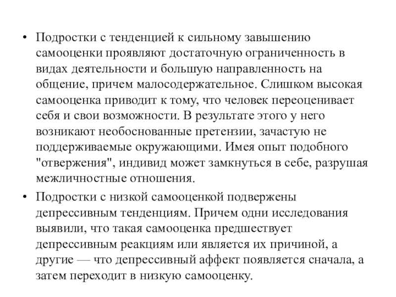 Подростки с низкой самооценкой подвержены депрессивным тенденциям. Причем одни исследования выявили, что такая самооценка предшествует депрессивным реакциям или является их причиной, а другие — что депрессивный аффект появляется сначала, а затем переходит в низкую самооценку.