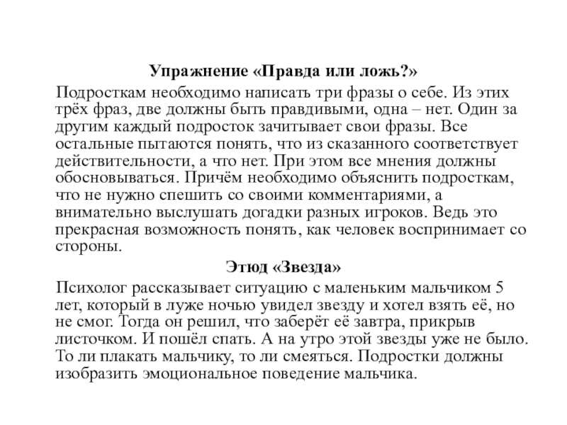 о себе. Из этих трёх фраз, две должны быть правдивыми, одна – нет. Один за другим каждый подросток зачитывает свои фразы. Все остальные пытаются понять, что из сказанного соответствует действительности, а что нет. При этом все мнения должны обосновываться. Причём необходимо объяснить подросткам, что не нужно спешить со своими комментариями, а внимательно выслушать догадки разных игроков. Ведь это прекрасная возможность понять, как человек воспринимает со стороны.