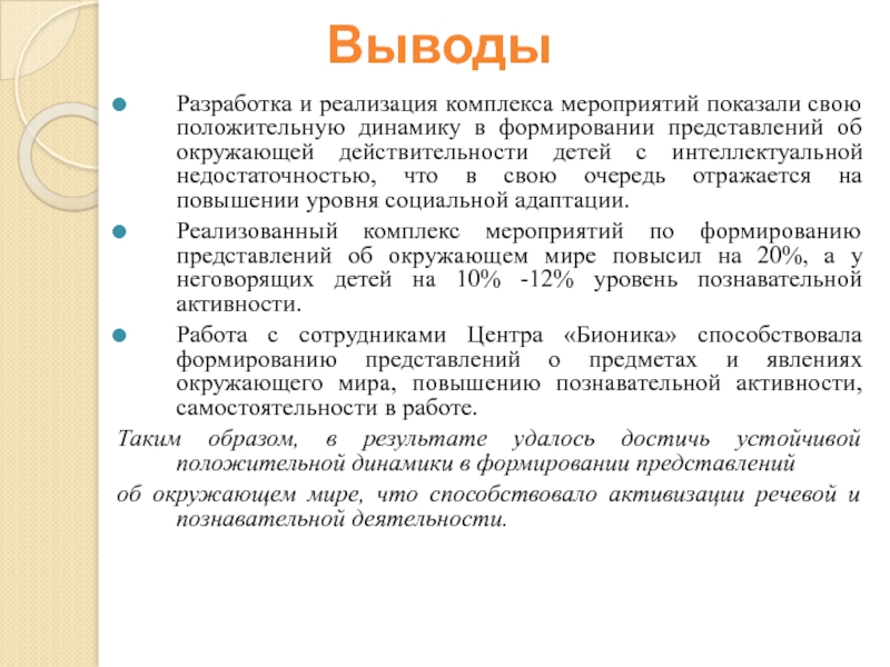 Реализованный комплекс мероприятий по формированию представлений об окружающем мире повысил на 20%, а у неговорящих детей на 10% -12% уровень познавательной активности.