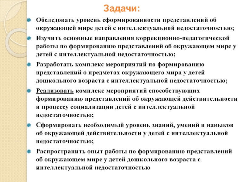 Разработать комплекс мероприятий по формированию представлений о предметах окружающего мира у детей дошкольного возраста с интеллектуальной недостаточностью;