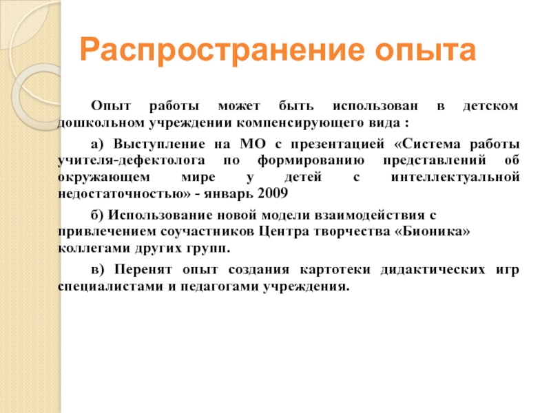 Распространить опыт работы по формированию представлений об окружающем мире у детей дошкольного возраста с интеллектуальной недостаточностью