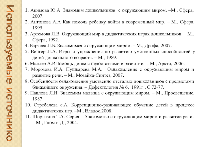 3. Артемова Л.В. Окружающий мир в дидактических играх дошкольников. – М., Сфера, 1992.