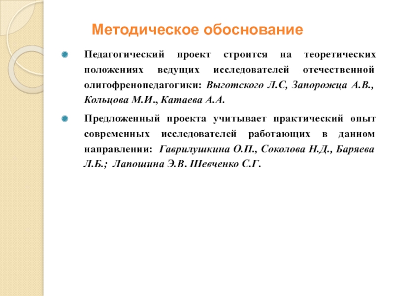 Педагогический проект строится на теоретических положениях ведущих исследователей отечественной олигофренопедагогики:
