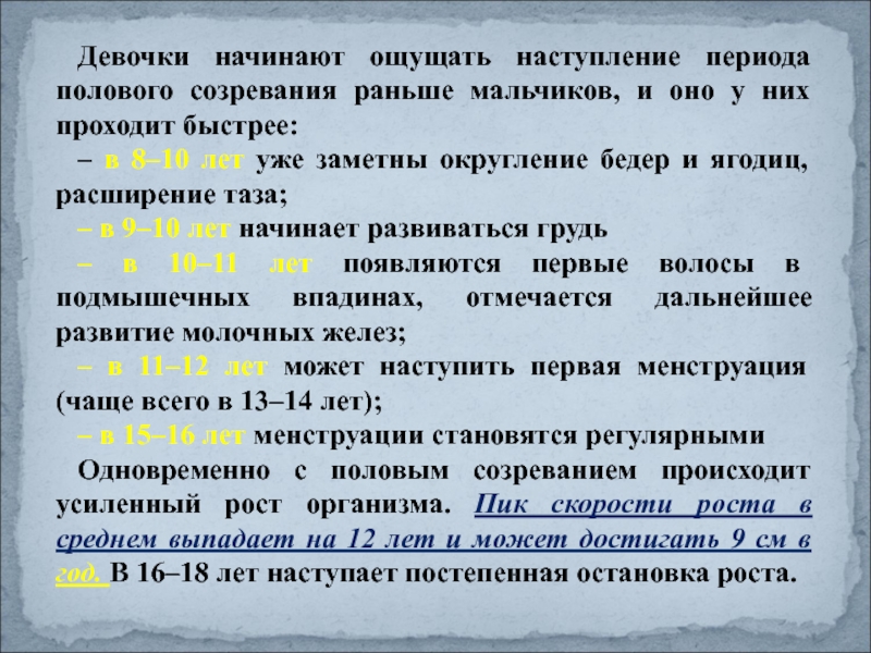 Слайд 7Девочки начинают ощущать наступление периода полового созревания раньше мальчиков, и оно
