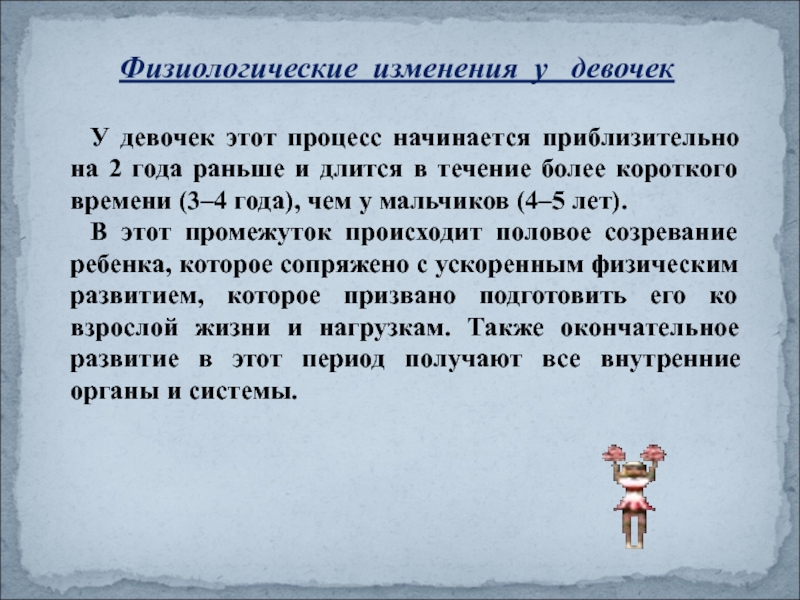 2 года раньше и длится в течение более короткого времени (3–4 года), чем у мальчиков (4–5 лет).