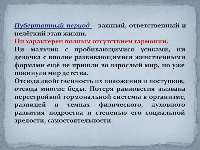 Слайд 12Пубертатный период – важный, ответственный и нелёгкий этап жизни.