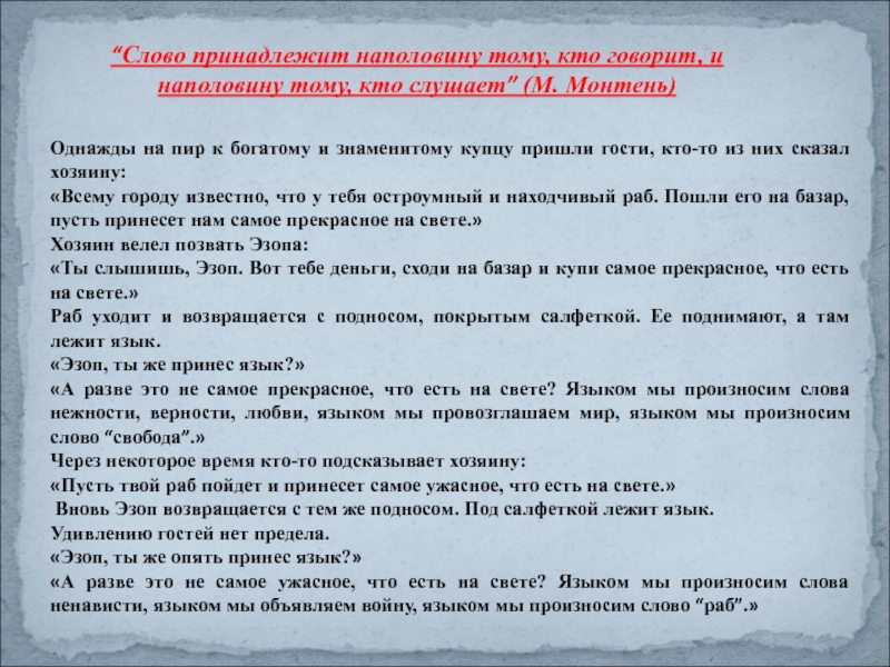 Слайд 14“Слово принадлежит наполовину тому, кто говорит, и наполовину тому, кто слушает”