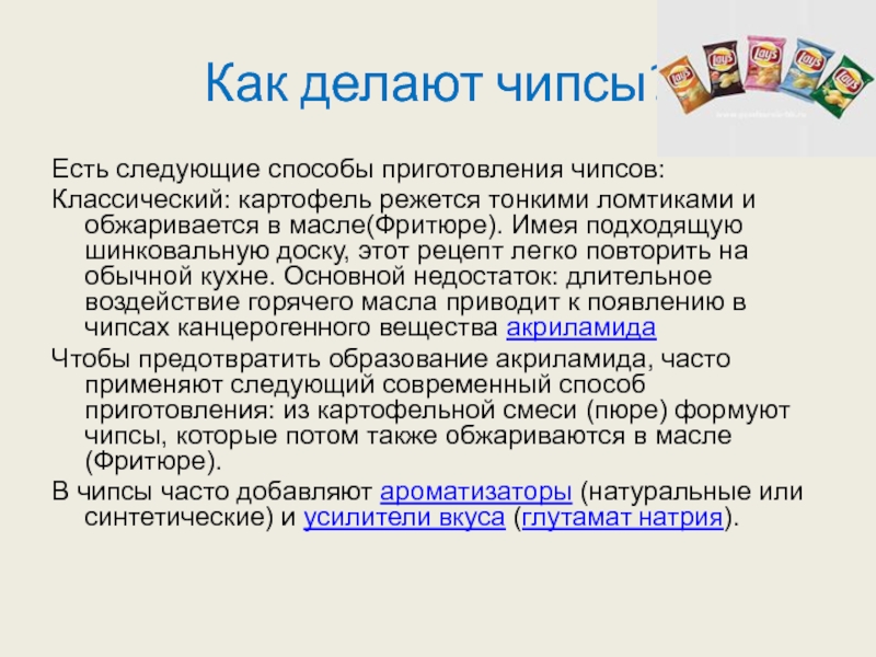 и обжаривается в масле(Фритюре). Имея подходящую шинковальную доску, этот рецепт легко повторить на обычной кухне. Основной недостаток: длительное воздействие горячего масла приводит к появлению в чипсах канцерогенного вещества акриламида