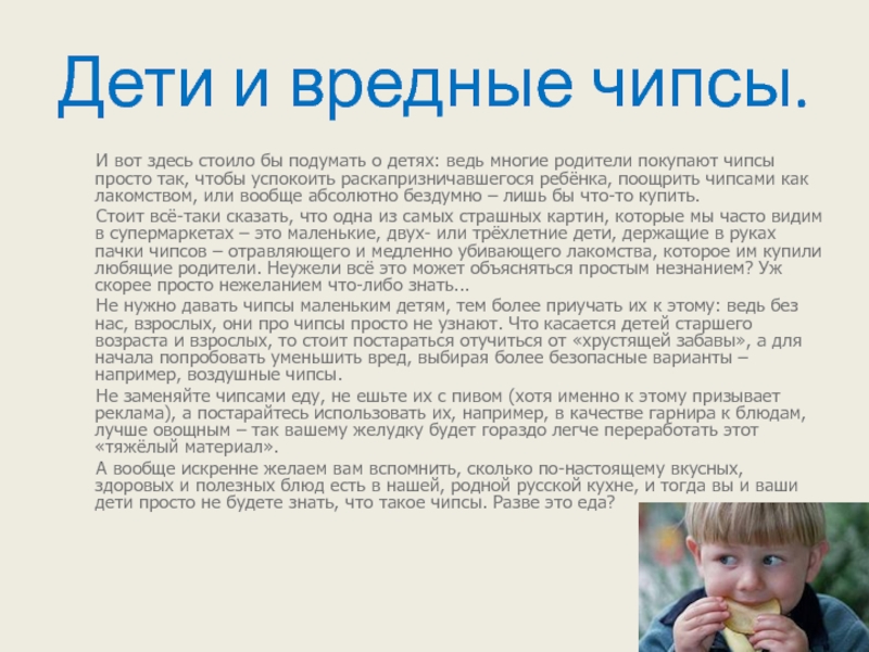 подумать о детях: ведь многие родители покупают чипсы просто так, чтобы успокоить раскапризничавшегося ребёнка, поощрить чипсами как лакомством, или вообще абсолютно бездумно – лишь бы что-то купить.