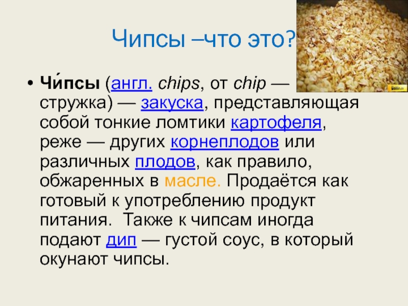 различных плодов, как правило, обжаренных в масле. Продаётся как готовый к употреблению продукт питания. Также к чипсам иногда подают дип — густой соус, в который окунают чипсы.