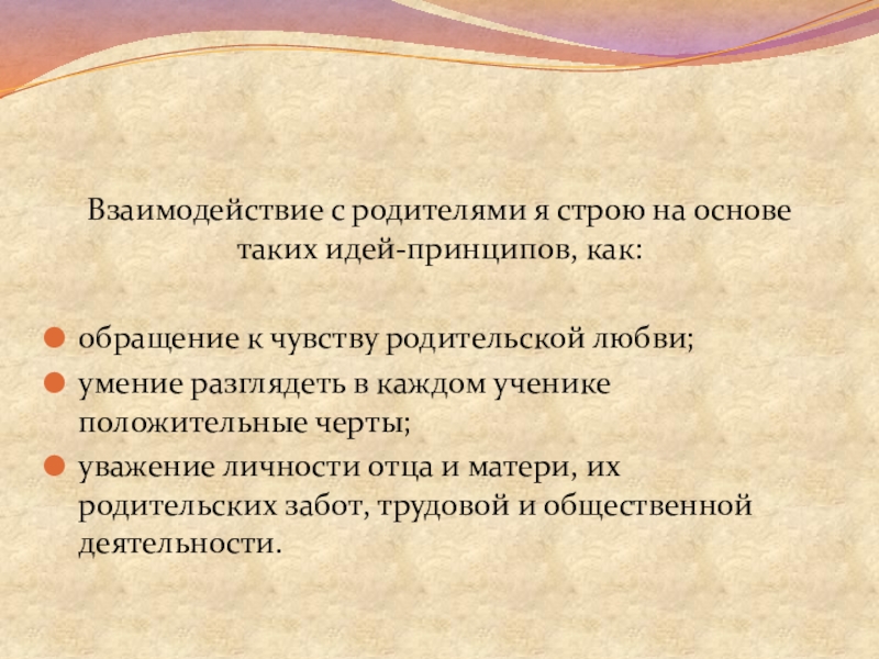 Слайд 8Взаимодействие с родителями я строю на основе таких идей-принципов, как: