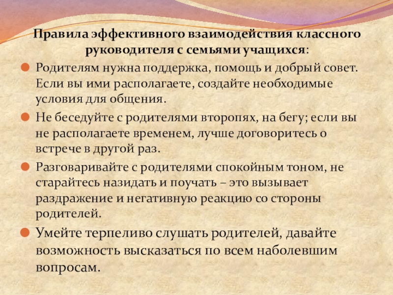 Не беседуйте с родителями второпях, на бегу; если вы не располагаете временем, лучше договоритесь о встрече в другой раз.