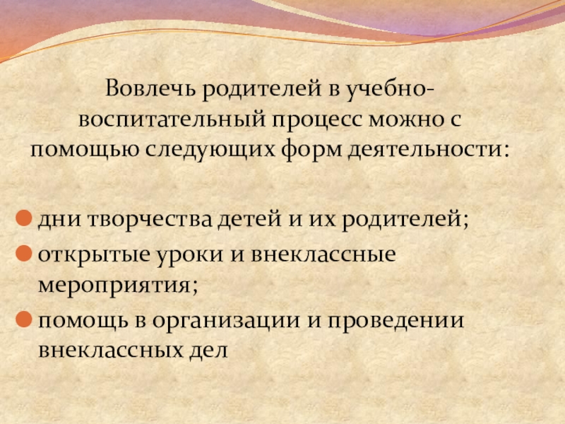 Слайд 11Вовлечь родителей в учебно-воспитательный процесс можно с помощью следующих форм деятельности: