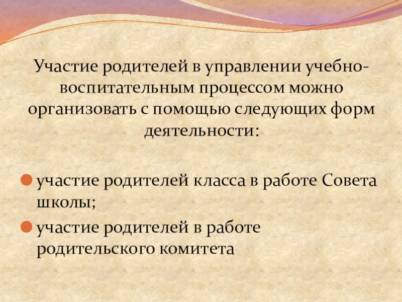 Слайд 12Участие родителей в управлении учебно-воспитательным процессом можно организовать с помощью следующих
