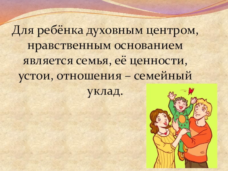 Слайд 4Для ребёнка духовным центром, нравственным основанием является семья, её ценности, устои,