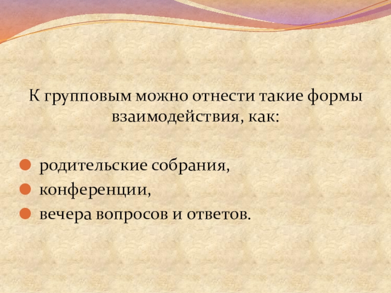 Слайд 16К групповым можно отнести такие формы взаимодействия, как: