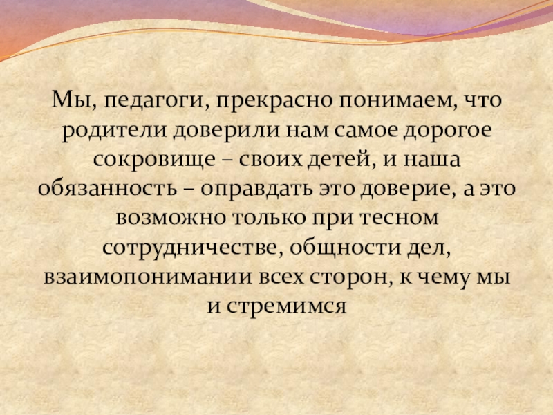 Слайд 19Мы, педагоги, прекрасно понимаем, что родители доверили нам самое дорогое сокровище