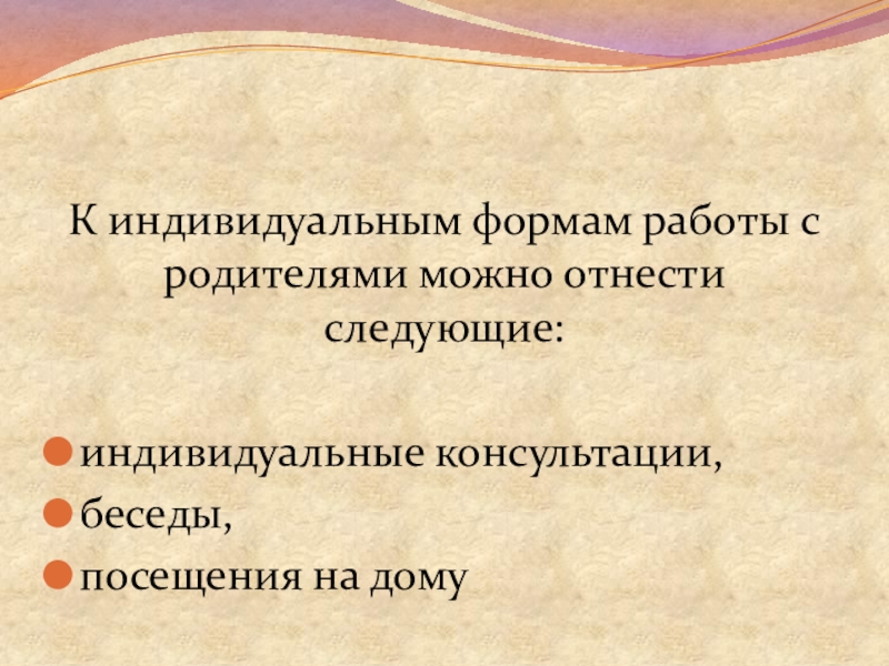 Слайд 17К индивидуальным формам работы с родителями можно отнести следующие: