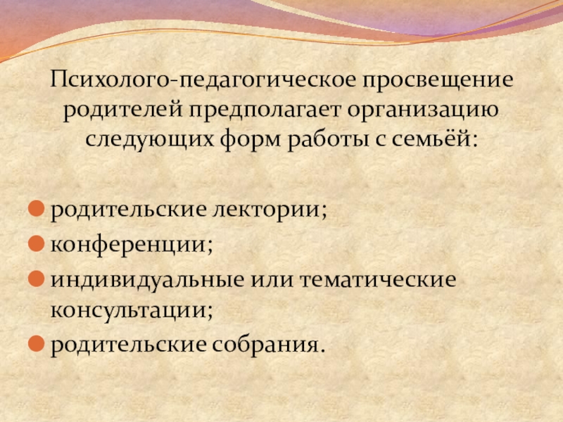 Слайд 10Психолого-педагогическое просвещение родителей предполагает организацию следующих форм работы с семьёй:
