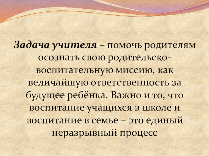 Слайд 7Задача учителя – помочь родителям осознать свою родительско-воспитательную миссию, как величайшую