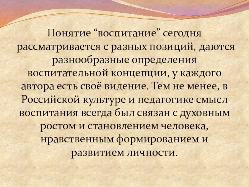 концепции, у каждого автора есть своё видение. Тем не менее, в Российской культуре и педагогике смысл воспитания всегда был связан с духовным ростом и становлением человека, нравственным формированием и развитием личности.
