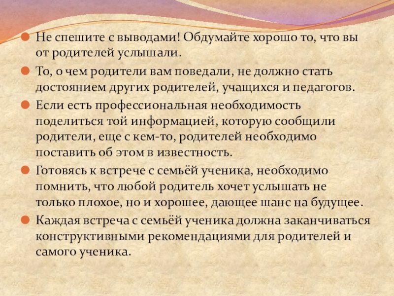 Готовясь к встрече с семьёй ученика, необходимо помнить, что любой родитель хочет услышать не только плохое, но и хорошее, дающее шанс на будущее.