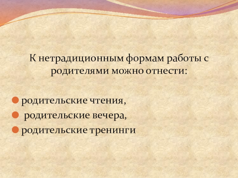 Слайд 18К нетрадиционным формам работы с родителями можно отнести: