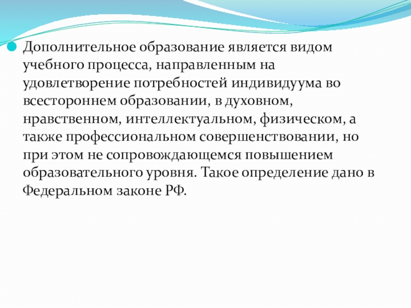Слайд 5Дополнительное образование является видом учебного процесса, направленным на удовлетворение потребностей индивидуума