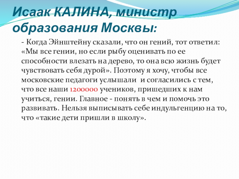 тот ответил: «Мы все гении, но если рыбу оценивать по ее способности влезать на дерево, то она всю жизнь будет чувствовать себя дурой». Поэтому я хочу, чтобы все московские педагоги услышали и согласились с тем, что все наши 1200000 учеников, пришедших к нам учиться, гении. Главное - понять в чем и помочь это развивать. Нельзя выписывать себе индульгенцию на то, что «такие дети пришли в школу».
