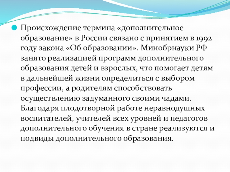 Слайд 10Происхождение термина «дополнительное образование» в России связано с принятием в 1992
