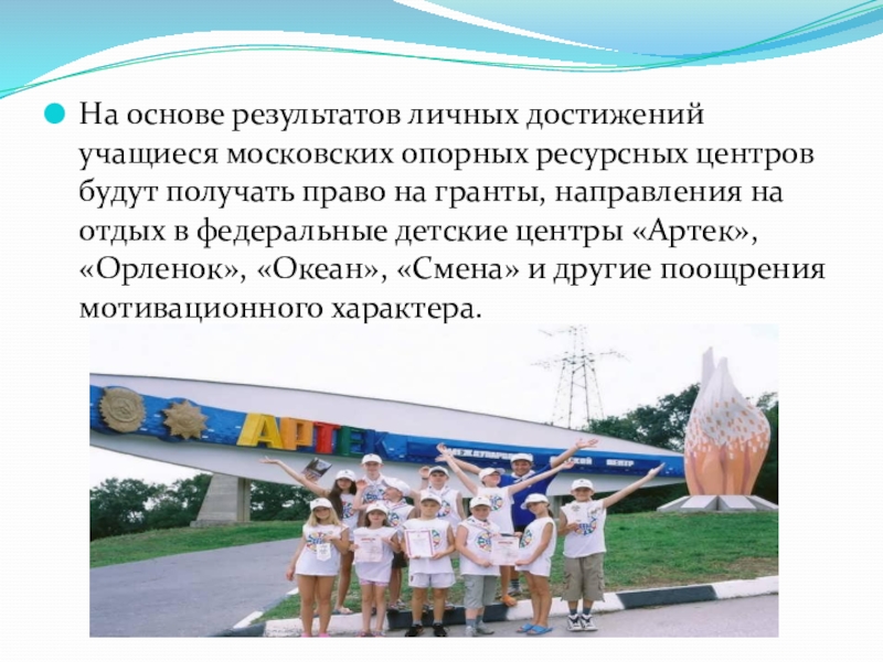 получать право на гранты, направления на отдых в федеральные детские центры «Артек», «Орленок», «Океан», «Смена» и другие поощрения мотивационного характера.