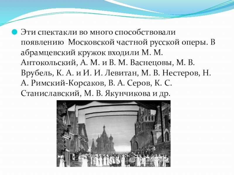 Слайд 22Эти спектакли во много способствовали появлению Московской частной русской оперы. В