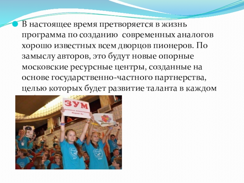 хорошо известных всем дворцов пионеров. По замыслу авторов, это будут новые опорные московские ресурсные центры, созданные на основе государственно-частного партнерства, целью которых будет развитие таланта в каждом ребенке.