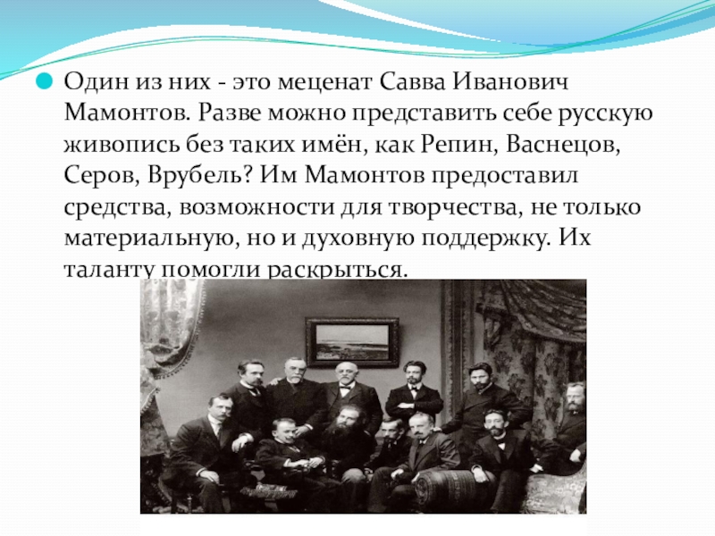 представить себе русскую живопись без таких имён, как Репин, Васнецов, Серов, Врубель? Им Мамонтов предоставил средства, возможности для творчества, не только материальную, но и духовную поддержку. Их таланту помогли раскрыться.