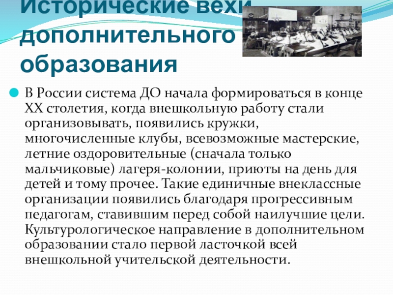 ХХ столетия, когда внешкольную работу стали организовывать, появились кружки, многочисленные клубы, всевозможные мастерские, летние оздоровительные (сначала только мальчиковые) лагеря-колонии, приюты на день для детей и тому прочее. Такие единичные внеклассные организации появились благодаря прогрессивным педагогам, ставившим перед собой наилучшие цели. Культурологическое направление в дополнительном образовании стало первой ласточкой всей внешкольной учительской деятельности.
