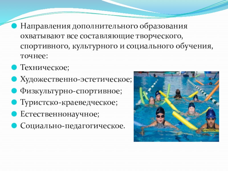 Слайд 9Направления дополнительного образования охватывают все составляющие творческого, спортивного, культурного и социального