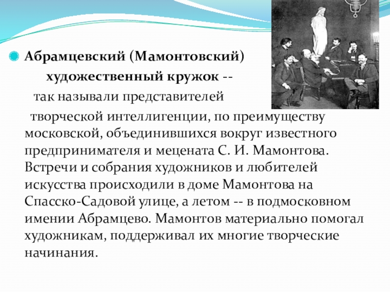 творческой интеллигенции, по преимуществу московской, объединившихся вокруг известного предпринимателя и мецената С. И. Мамонтова. Встречи и собрания художников и любителей искусства происходили в доме Мамонтова на Спасско-Садовой улице, а летом -- в подмосковном имении Абрамцево. Мамонтов материально помогал художникам, поддерживал их многие творческие начинания.