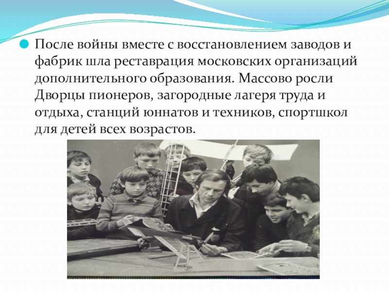 организаций дополнительного образования. Массово росли Дворцы пионеров, загородные лагеря труда и отдыха, станций юннатов и техников, спортшкол для детей всех возрастов.