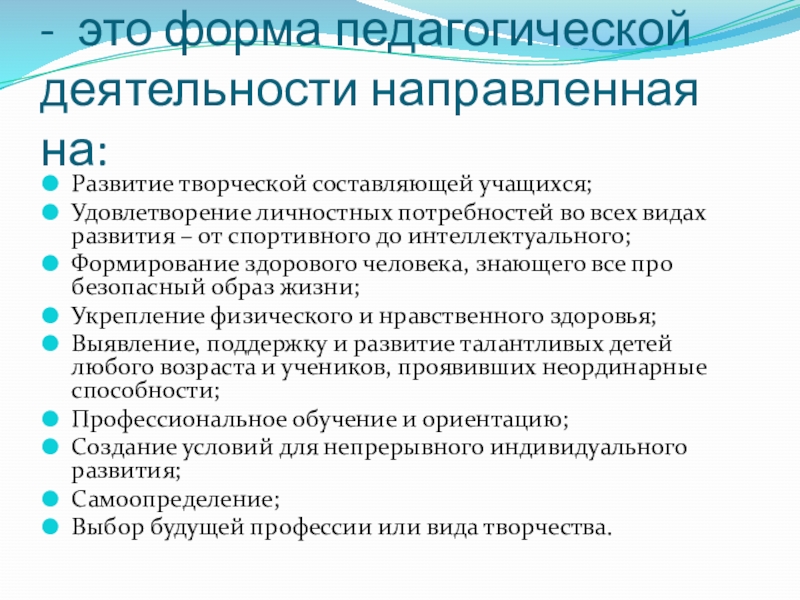 Слайд 7Дополнительное образование - это форма педагогической деятельности направленная на: