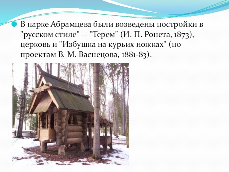 Слайд 20В парке Абрамцева были возведены постройки в "русском стиле" -- "Терем"