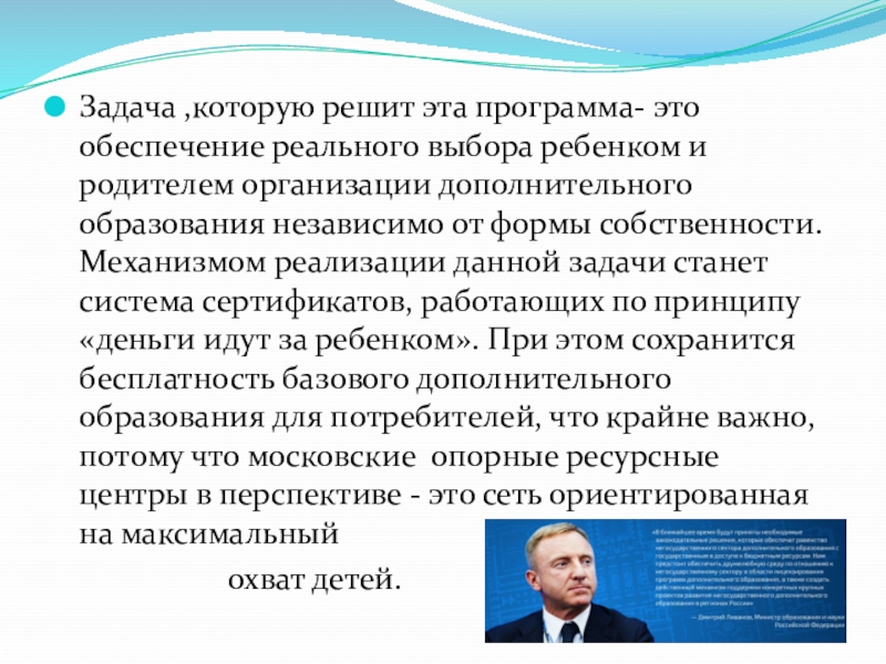 родителем организации дополнительного образования независимо от формы собственности. Механизмом реализации данной задачи станет система сертификатов, работающих по принципу «деньги идут за ребенком». При этом сохранится бесплатность базового дополнительного образования для потребителей, что крайне важно, потому что московские опорные ресурсные центры в перспективе - это сеть ориентированная на максимальный