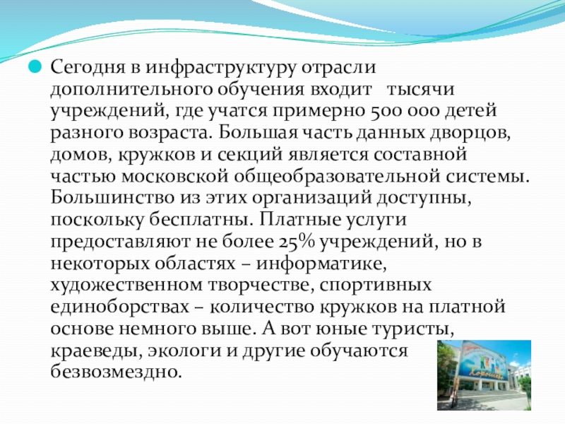 учатся примерно 500 000 детей разного возраста. Большая часть данных дворцов, домов, кружков и секций является составной частью московской общеобразовательной системы. Большинство из этих организаций доступны, поскольку бесплатны. Платные услуги предоставляют не более 25% учреждений, но в некоторых областях – информатике, художественном творчестве, спортивных единоборствах – количество кружков на платной основе немного выше. А вот юные туристы, краеведы, экологи и другие обучаются безвозмездно.