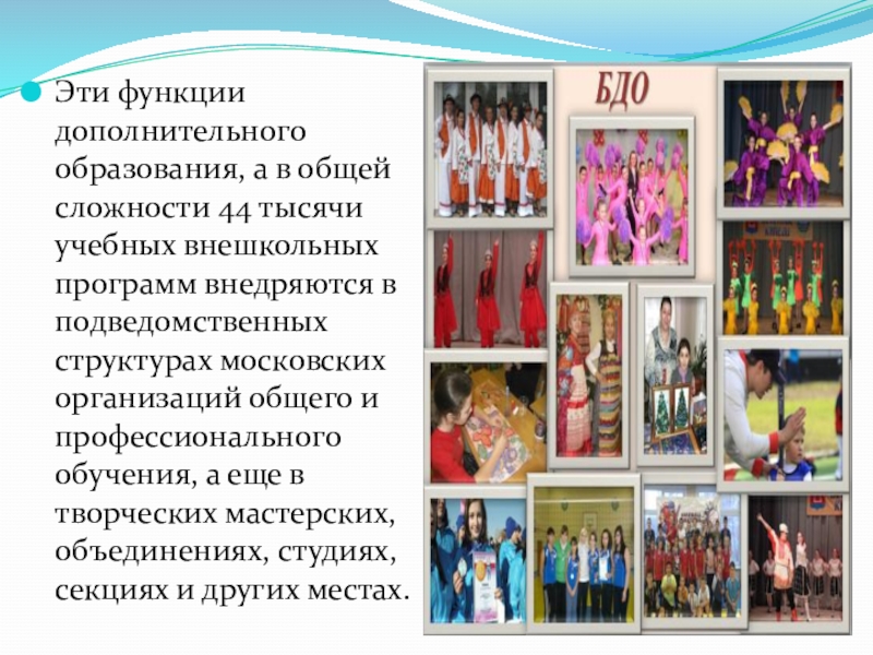 учебных внешкольных программ внедряются в подведомственных структурах московских организаций общего и профессионального обучения, а еще в творческих мастерских, объединениях, студиях, секциях и других местах.