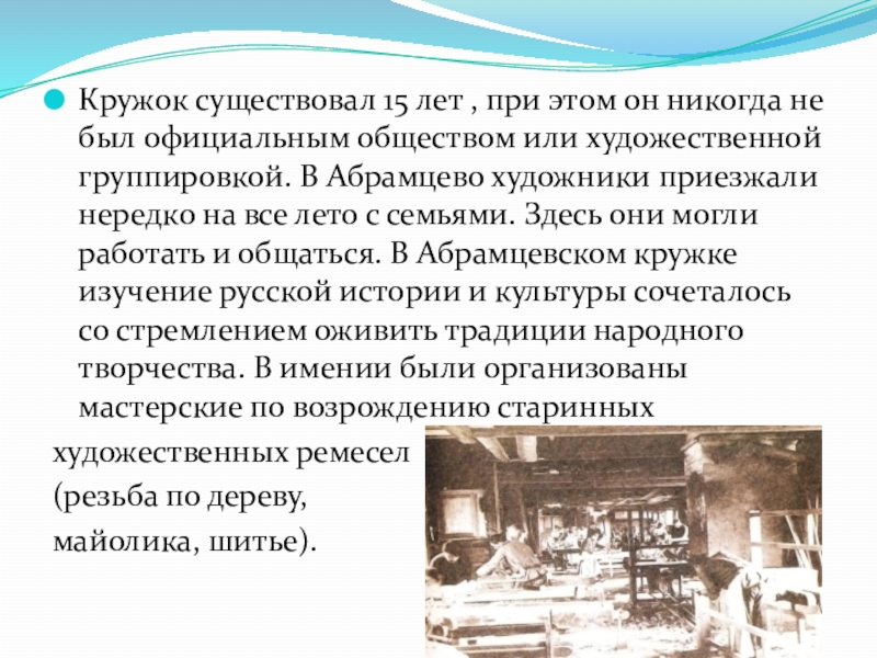 официальным обществом или художественной группировкой. В Абрамцево художники приезжали нередко на все лето с семьями. Здесь они могли работать и общаться. В Абрамцевском кружке изучение русской истории и культуры сочеталось со стремлением оживить традиции народного творчества. В имении были организованы мастерские по возрождению старинных