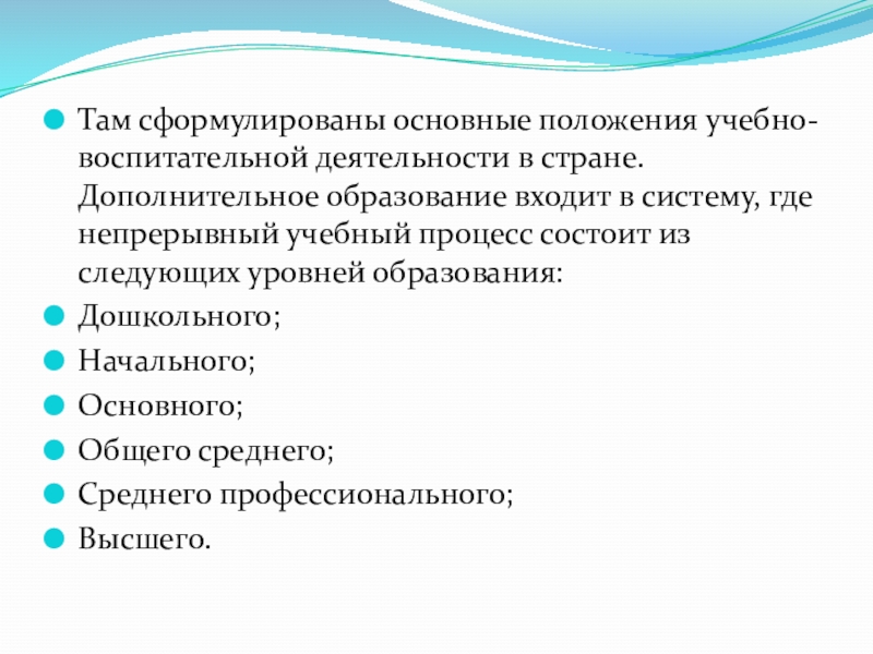 Слайд 6Там сформулированы основные положения учебно-воспитательной деятельности в стране. Дополнительное образование входит