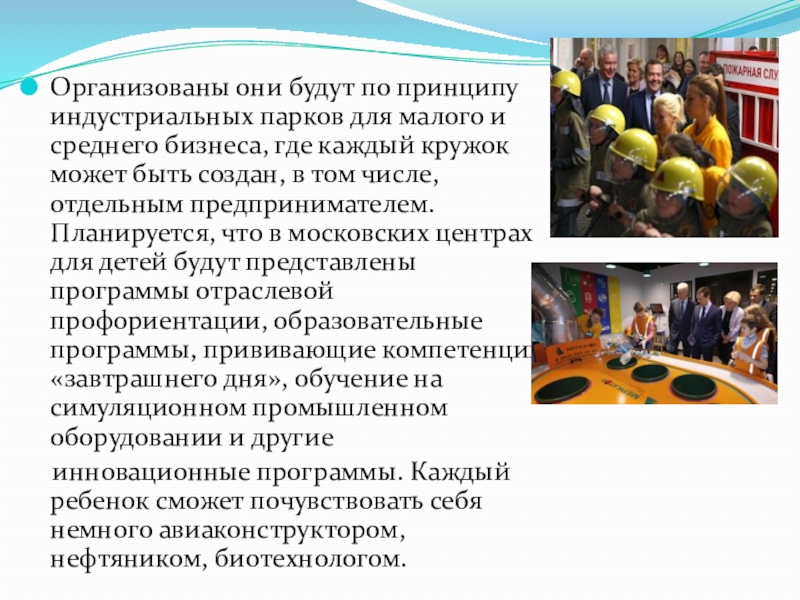 бизнеса, где каждый кружок может быть создан, в том числе, отдельным предпринимателем. Планируется, что в московских центрах для детей будут представлены программы отраслевой профориентации, образовательные программы, прививающие компетенции «завтрашнего дня», обучение на симуляционном промышленном оборудовании и другие