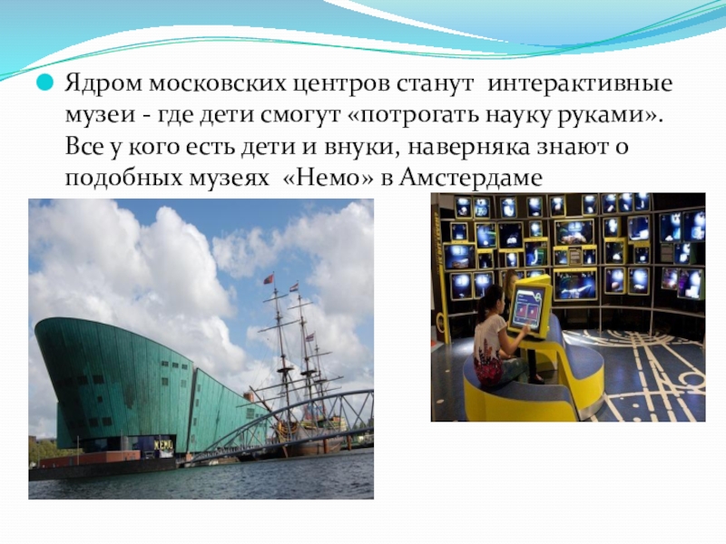 Слайд 25Ядром московских центров станут интерактивные музеи - где дети смогут «потрогать