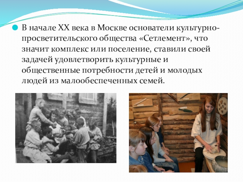 Слайд 12В начале ХХ века в Москве основатели культурно-просветительского общества «Сетлемент», что